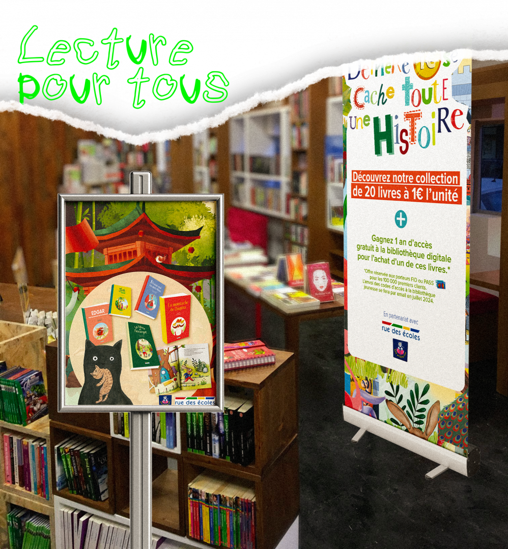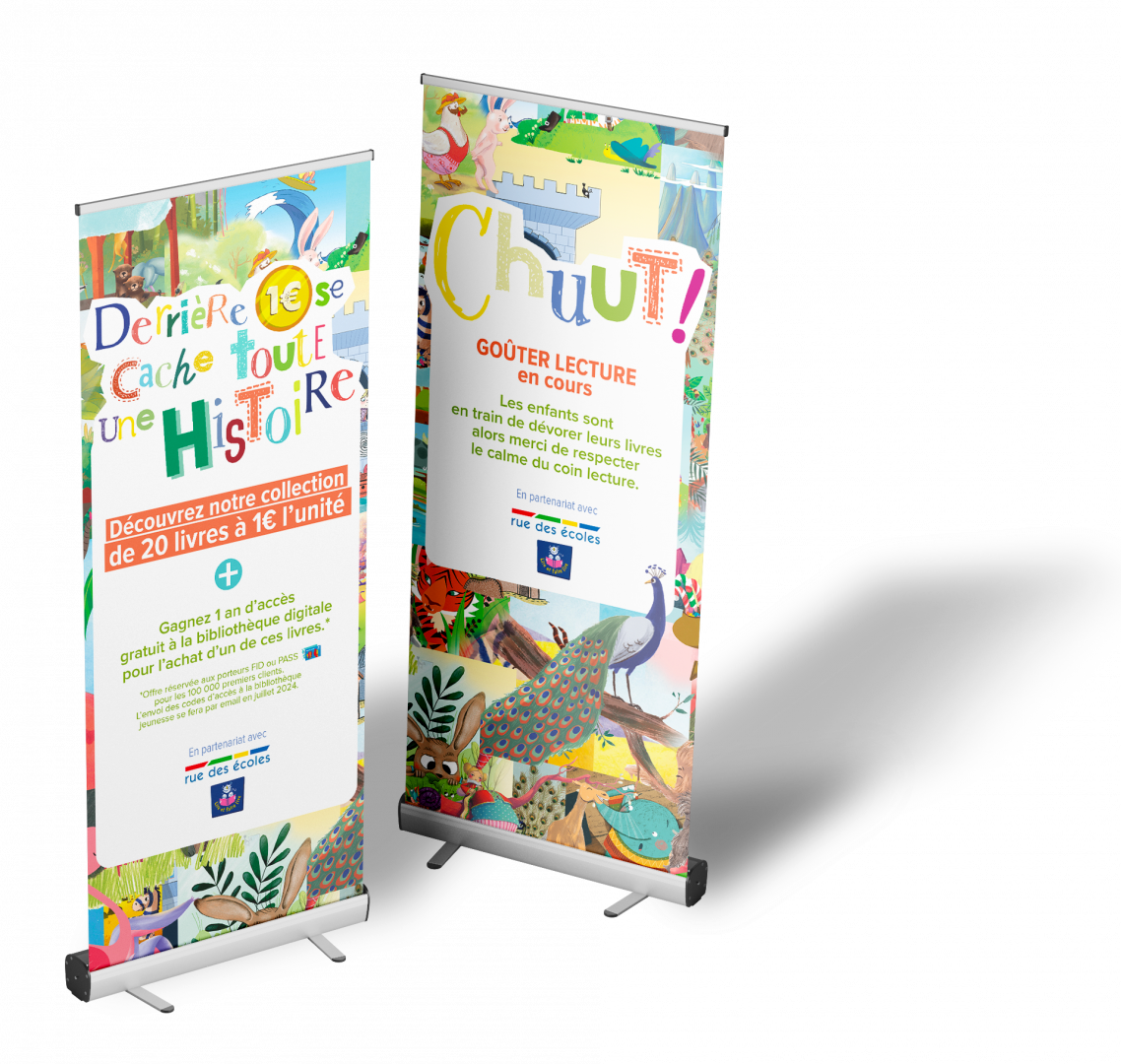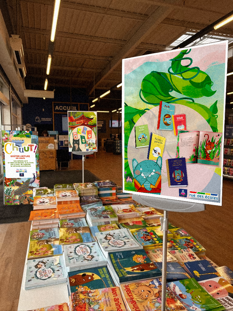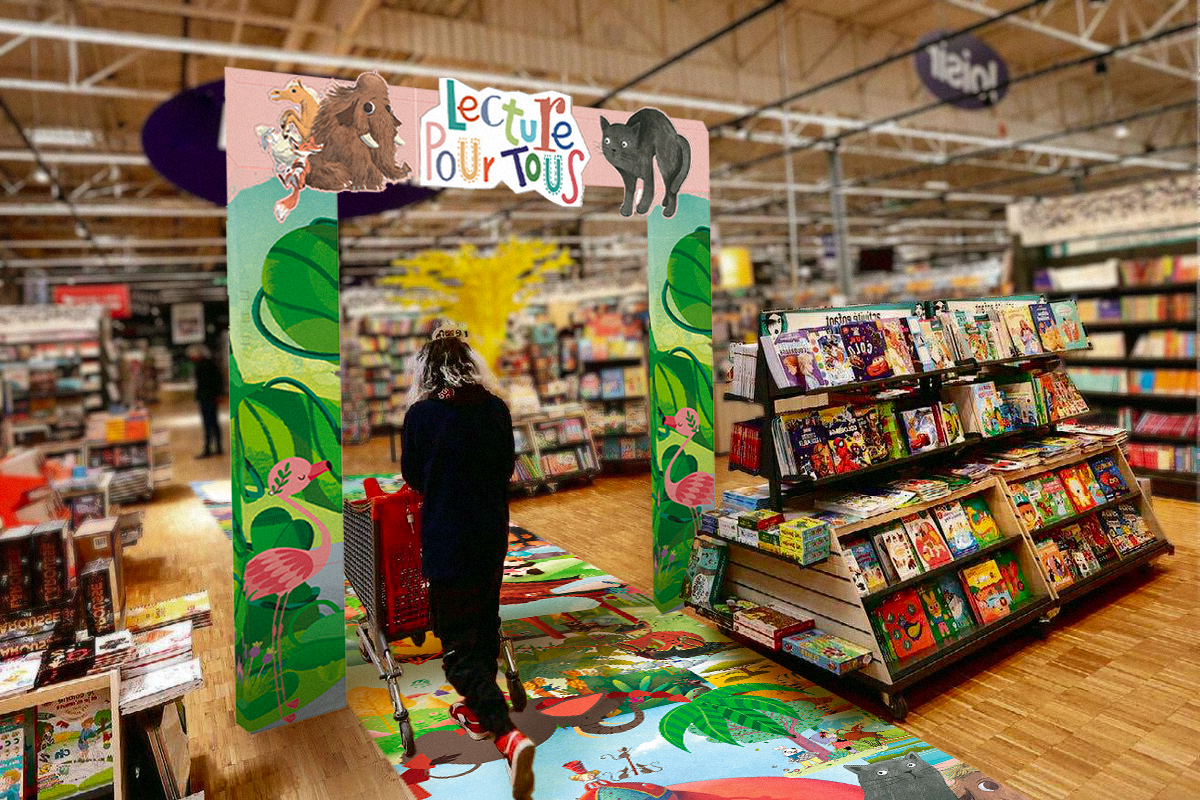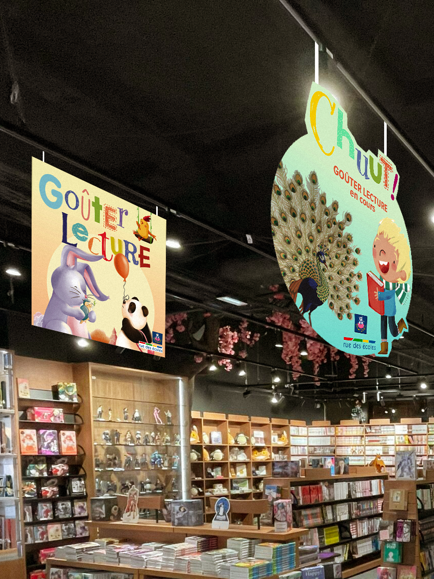 Le projet inclut la création de PLV sur différents supports, en reprenant les dess illustrations des livres pour une cohérence visuelle forte. Un espace dédié en magasin est également pensé pour renforcer l’opération, avec des ateliers de lecture encourageant l’éveil et le partage autour du livre. L’enjeu est de transformer ce rayon en un véritable lieu d’expérience, où petits et grands découvrent ensemble le plaisir de lire.