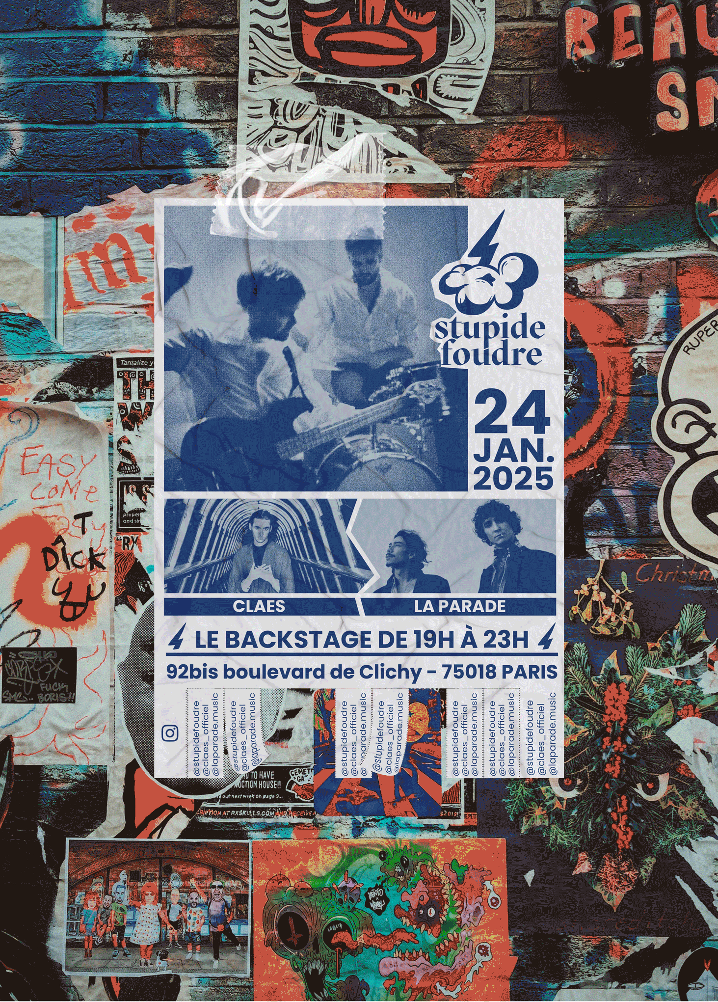 Cette dualité façonne toute la direction artistique du groupe : un mélange d’éléments décalés et naïfs, juxtaposés à des visuels sombres, électriques et incontrôlables. Chaque création – du logo aux pochettes d’albums, en passant par les affiches et le merchandising – joue sur cet équilibre fragile entre l’absurde et la déflagration brutale, donnant à Stupide Foudre une identité unique.