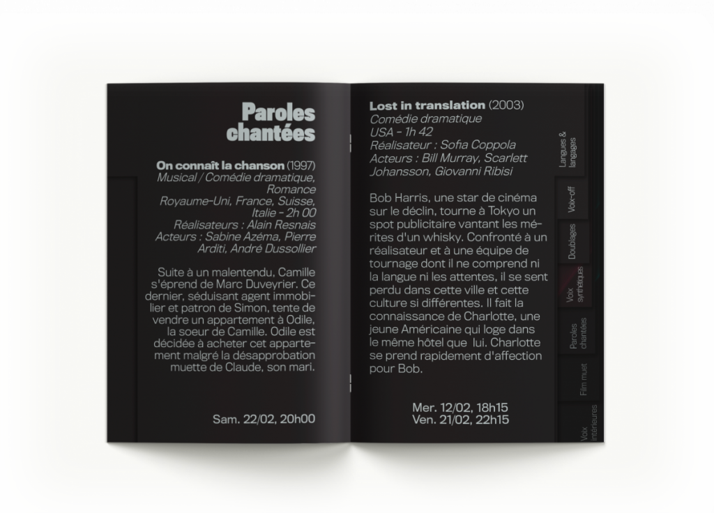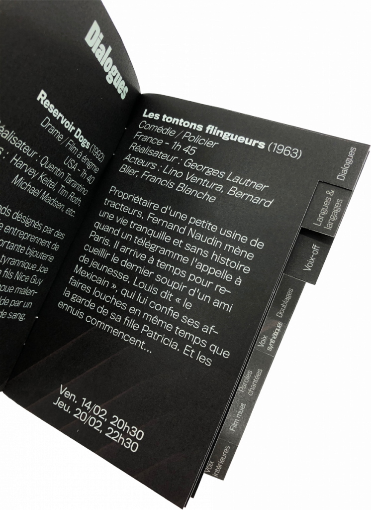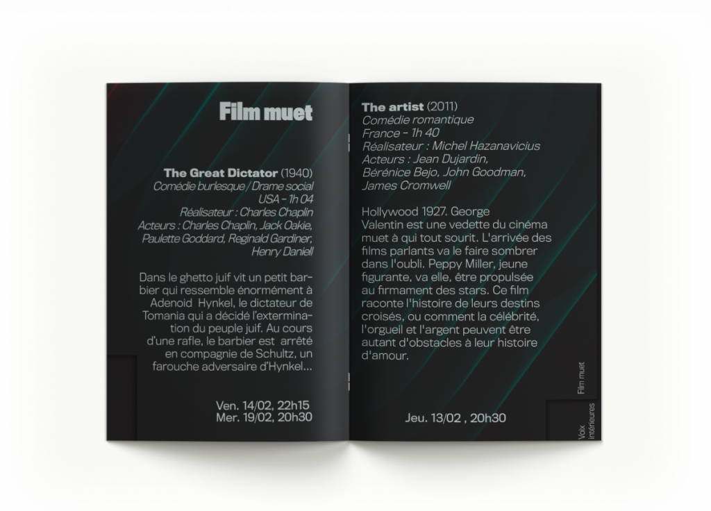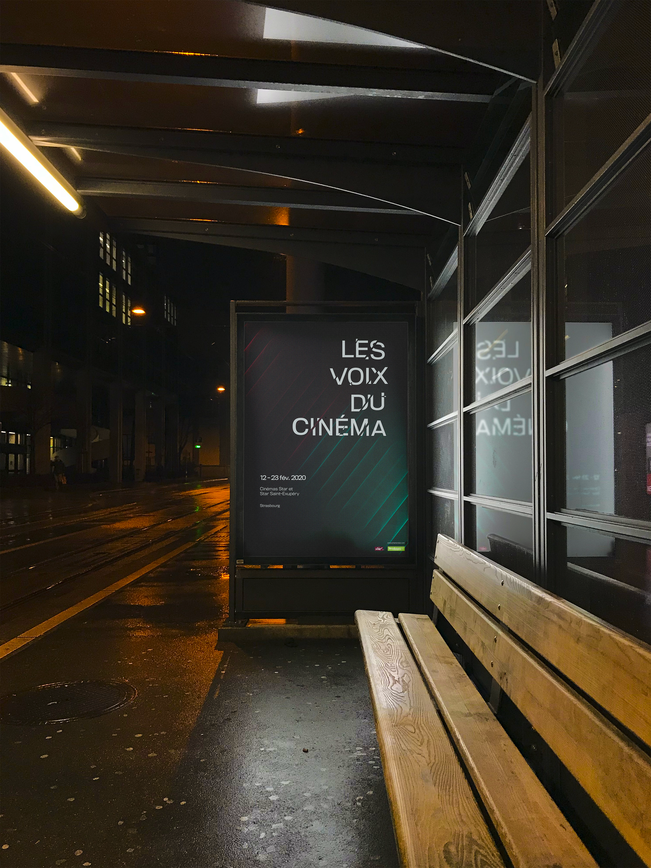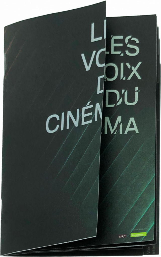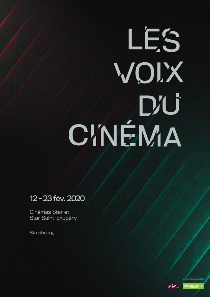 Le titre « Les Voix du Cinéma » est fragmenté, comme impacté par le son, avec des éclats qui semblent projetés par les vibrations. Les dates du festival suivent les lignes de la trame, tandis que les logos viennent ancrer le regard en bas du visuel. La composition suit une lecture en Z, dynamisée par la diagonale lumineuse qui traverse l’affiche.
