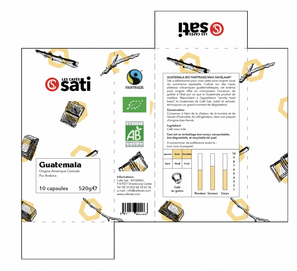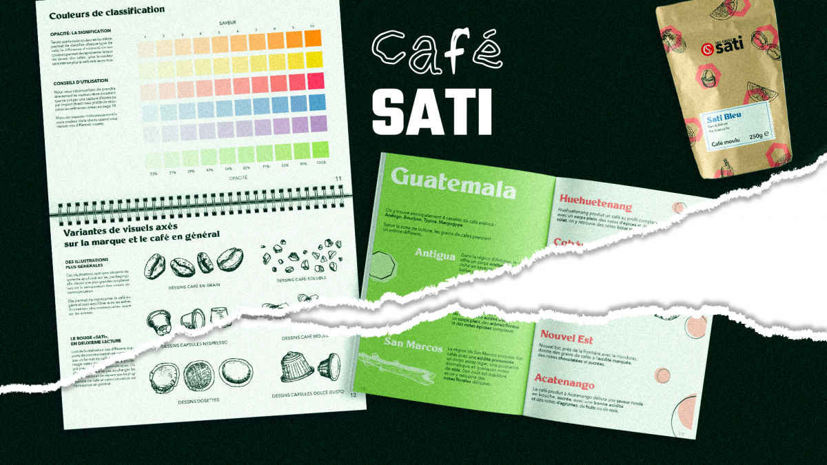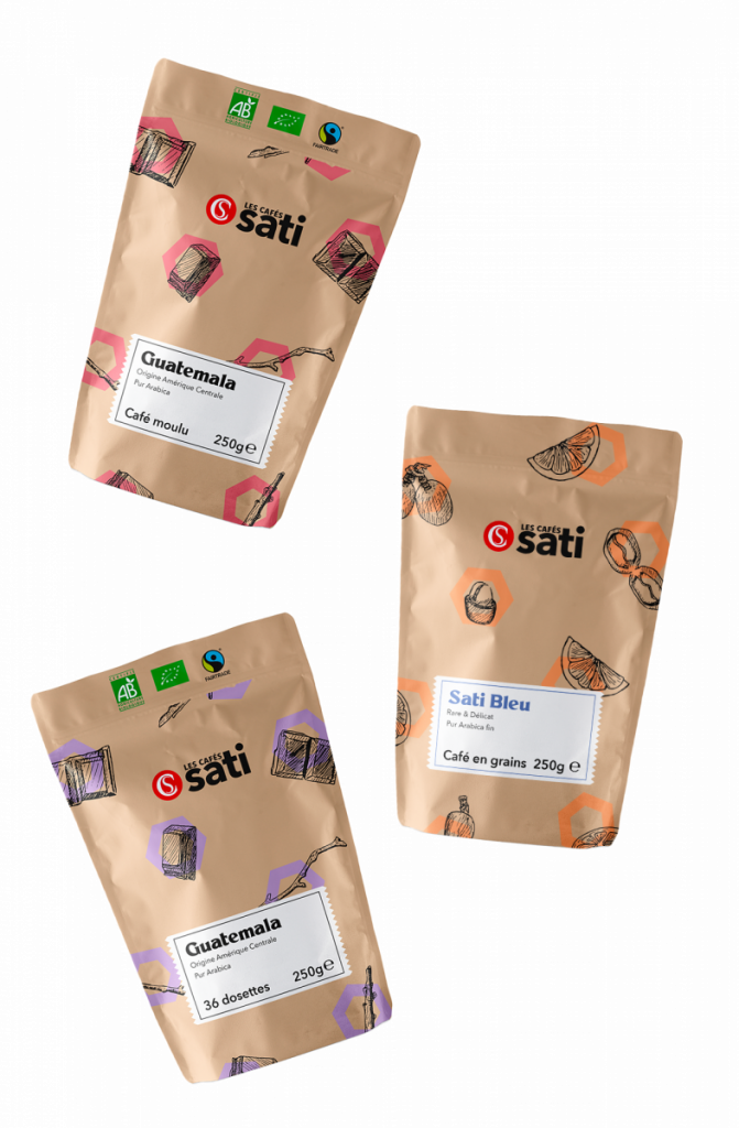 Avec une large gamme de cafés, Café Sati adopte une nouvelle charte graphique permettant de classer chaque café selon ses arômes et son intensité. Ce système repose sur un codage visuel combinant dessins, couleurs et formes, offrant ainsi une identité cohérente sans être répétitive sur les packagings.