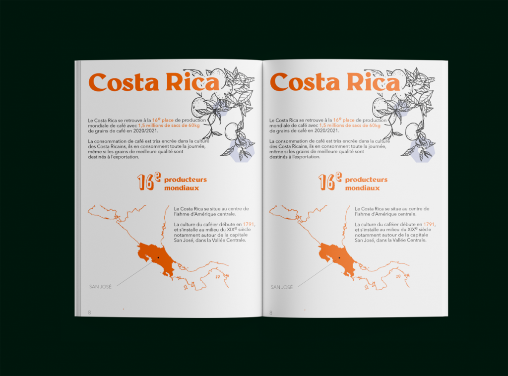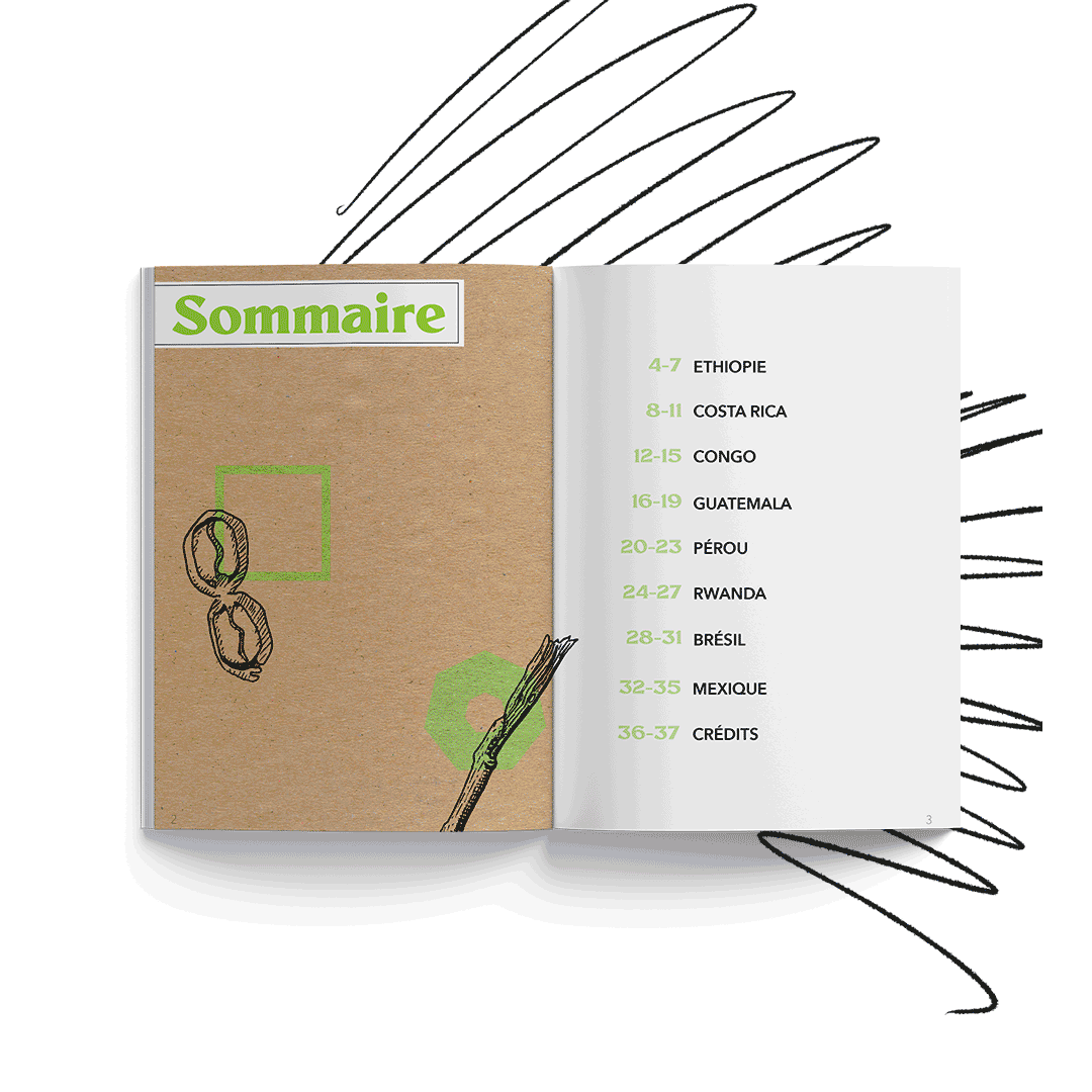 Cette édition explore les origines et les spécificités des différents cafés, offrant un regard détaillé sur leurs terroirs et leurs arômes. Structurée en accord avec la charte graphique, elle reprend les couleurs, dessins et formes qui caractérisent chaque produit café, facilitant la lecture et la compréhension des distinctions entre les variétés.